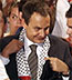 Ante la gravedad de la situación en Oriente Medio, el presidente del Gobierno español, J.L.R. Zapatero, decide con arrojo pasar de las palabras a los hechos: Posa jovialmente (siempre por delante el buen talante) con un típico pañuelo palestino...