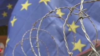Ayer la calle Txapitela de Iruña se convirtió en una improvisada frontera en una espectacular acción denunciando la política de la UE con los refugiados