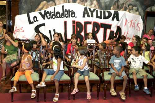 Lxs jóvenes , que desplegaron una pancarta donde se podía leer "La verdadera ayuda es su libertad". "Menos fotos,Más hechos", comenzaron a lanzar gritos de "Sahara libre", lo que enojó a Ricardo Melchior "porque es una falta de respeto en el salón noble de todos los tinerfeños", y levantó la sesión, ante las miradas estupefactas de lxs niñxs saharauis.