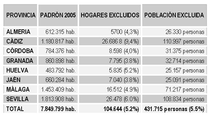 Como podemos observar existen importantes diferencias entre las provincias andaluzas. En primer lugar está Cádiz que se lleva el ranking con el 9.4% de población excluida, le sigue Sevilla con el 6%. Alrededor del 5% se sitúan Huelva y Málaga. Córdoba y Almería rondan el 4%. Por último, Granada y Jaén sólo presentan el 3.8% de exclusión cada una.