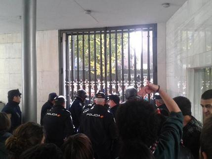 Una vez en la puerta de la delegación, muchos estudiantes, al grito de ocupación, trataron de entrar en el edificio, a lo que la policía reaccionó tratando de cerrar las puertas de este edificio público. En el forcejeo entre agentes y alumnos del que resultó levemente herida una chica por los tirones de pelo que un policía le dió, la policía consiguió cerrar las puertas, dejando dentro a unos 30 manifestantes encerrados durante algún tiempo. Tras una leve negociación, los alumnos secuestrados pudieron ser liberados.