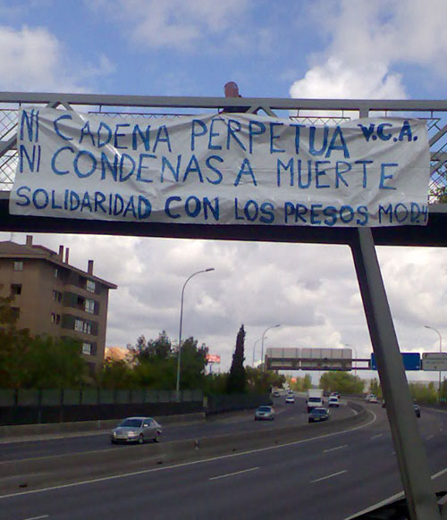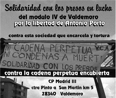 Como venimos informando desde hace ya más de un mes, el módulo 4 de aislamiento de la cárcel de Madrid III en Valdemoro permanece en lucha. Antonio Porto Martín, un destacado participante de las luchas anticarcelarias durante los últimos 20 años permanece en huelga de hambre y patio indefinidas desde hace casi 40 días y sus compañeros de módulo no han dudado desde el primer momento en sumarse a su lucha realizando ayunos y txapeos solidarios una vez a la semana e informando a la calle a través de comunicados de lo que está sucediendo. Como se viene denunciando desde muy diferentes espectros sociales y políticos, la cadena perpetua existe en el estado español y es aplicada a través de los nuevos mecanismos jurídicos y reformas judiciales. La cadena perpetua encubierta está comenzando a ser aplica a los presos de ETA, GRAPO y también a los presos más rebeldes e insumisos, aquellos que se han levantado y rebelado contra la sumisión y el extermino psíquico y físico que genera la cárcel. Por eso debemos apoyar a estas personas, porque ellas son parte de la resistencia ante esa máquina de aniquilar seres humanos, que es el sistema penitenciario.