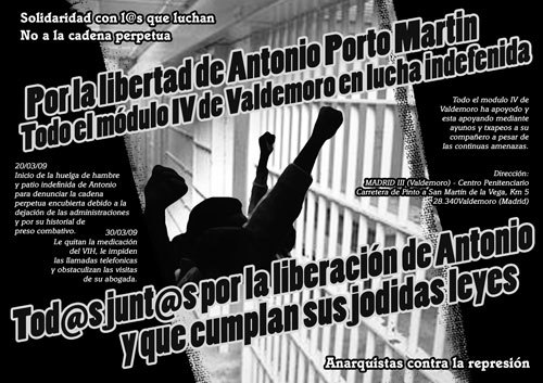 Como ya hemos dicho en anteriores comunicados, desde que Antonio Porto Martín empezó la huelga de patio y hambre el día 21-03-09, los internos del Módulo nº4 de Valdemoro, hemos hecho algunos chapeos en solidaridad con el compañero Antonio, los días 27-03-09, 03-04-09 y 11-04-09, y como ya es sabido, los continuaremos haciendo hasta que nos/le atiendan a las peticiones que está haciendo para que le hagan una liquidación de todas sus condenas en un bloque de condena que se ajuste a sus Leyes, o 20 años, 25 años, 30 años, que es lo estipulado por Ley.