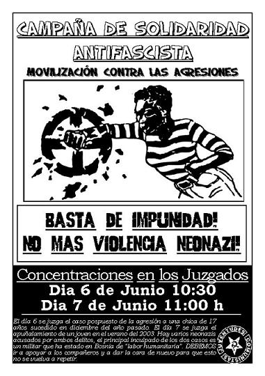 El día 6 se juzga el caso pospuesto de la agresión a una chica de 17 años sucedido en diciembre del año pasado. El día 7 se juzga el apuñalamiento de un joven en el verano del 2003. Hay varios neonazis acusados por ambos delitos, el principal inculpado de los dos casos es un militar que ha estado en Bosnia de "labor humanitaria". DEBEMOS ir a apoyar a los compañeros y a dar la cara de nuevo para que esto no se vuelva a repetir.