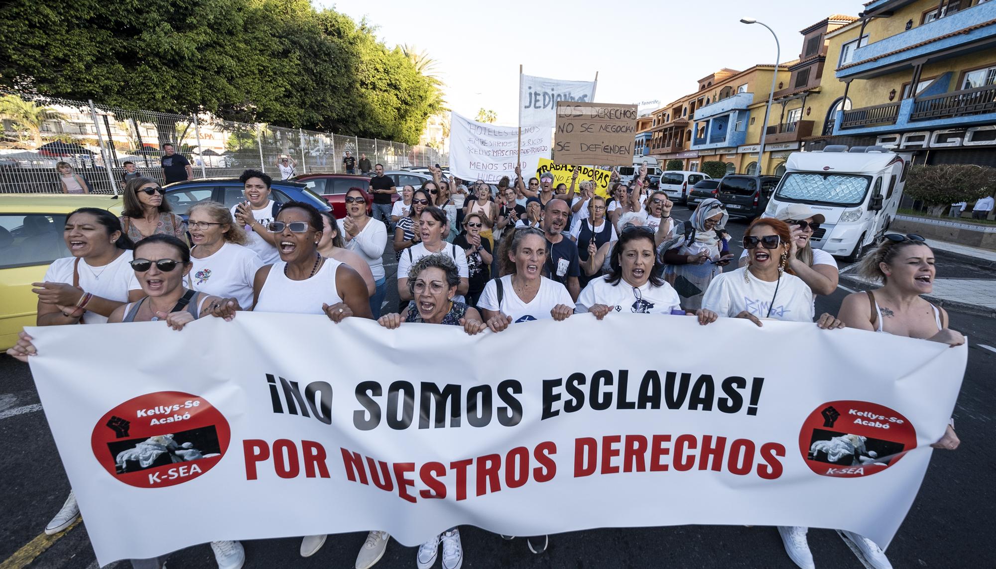 Marcia Díaz, portavoz de la asociación Las Kellys en Gran Canaria, cuenta a El Salto que se suman a esta convocatoria del 20-A: “Porque somos parte de este pueblo explotado, porque desde que nos fundamos nuestra lucha va encaminada a la mejora de la clase trabajadora, que es la que produce la riqueza. Para ello siempre hemos dicho que este modelo de turismo no nos sirve. Es colonialismo porque ofrece sueldos míseros a nuestra gente, así como condiciones laborales de explotación moderna y destrucción de nuestro medio ambiente. Mientras tanto, este sistema enriquece a un empresario que obtiene beneficios desorbitados y, todavía, quiere más”. Añade: “Como nosotras, hay muchas con trabajos invisibles pero absolutamente imprescindibles para el sector turismo. Esta invisibilidad y la no regularización de las personas que trabajan de manera ilegal son las que más constituyen, junto a otros sectores, la explotación moderna debido a la sobrecarga de trabajo que puede llegar a superar las doce horas en algunos casos. La precariedad en el contrato y la externalización de los servicios provocan que tengamos unas nóminas bajísimas. Estas condiciones nos llevan a un estado insalubre y, en la mayoría de los casos, tenemos que sobremedicarnos para sobrevivir. La salud y la dignidad no se negocian”.