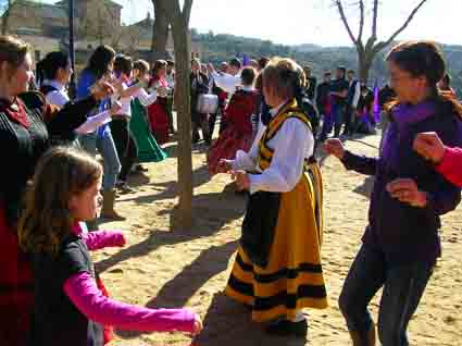 Bajo un sol de justicia el grupo folklórico Magerit, llegado desde Madrid, desgranaba con gran maestría uno a uno sus temas y bailes a lo largo de la plaza, bajo la atenta mirada y gozo de los turistas y de las y los participantes al acto.