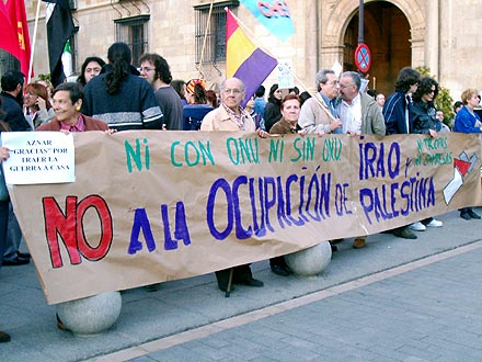 Las soflamas son constantes: "Vuestras son las guerras, nuestros son los muertos" "No más sangre por petróleo" "Vosotros fascistas sois los terroristas" "OTAN no, bases fuera" "Si, si, si resistencia Iraquí" son los lemas más coreados.