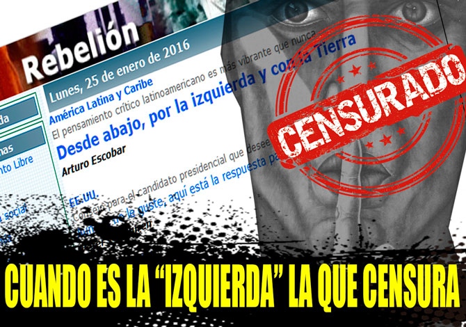 El pasado miércoles, día 20 de enero, Rebelión publicó un artículo de mi autoría —"Hipócritas y mentirosos, dos palabras que definen muy bien a los dirigentes de PODEMOS"— para, sin previo aviso, retirarlo a las pocas horas. Acababa de consumarse una censura en toda regla. Obviamente, exigí explicaciones por tan lamentable suceso y, tres días después, se me envío una nota confirmándose la censura, por supuesto que sin nombrar esa palabra.