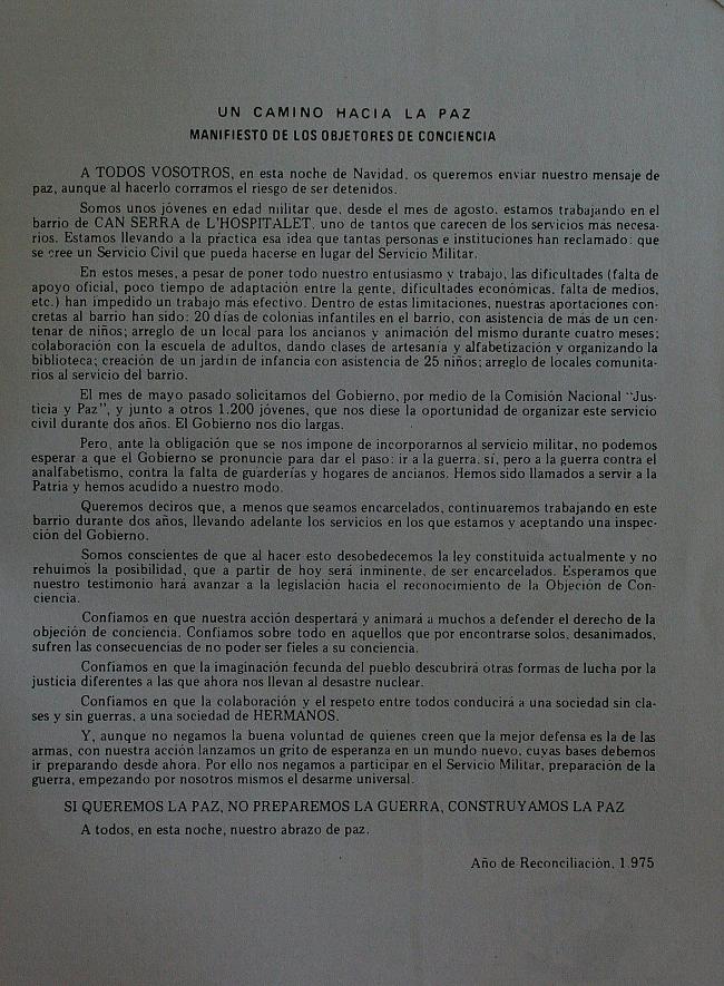 El mensaje lo firmaba un grupo de jóvenes y se leyó en varias iglesias catalanas durante la misa del Gallo en la noche de Navidad de 1975. Anunciaban que se negaban a hacer el servicio militar y que, como contrapartida, llevaban ocho meses inmersos en un proyecto social de ayuda a los vecinos en el barrio de Can Serra, en L’Hospitalet de Llobregat. Ofrecían labores de alfabetización, cuidado de ancianos y un servicio de guardería, entre otras actividades.