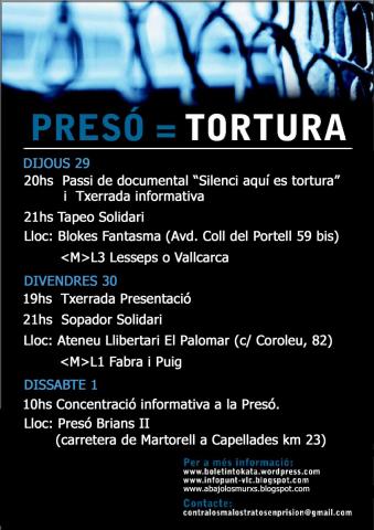 De la persona que va començar els dejunis al C.P. Ponent a l’agost i que els fa setmanalment la repressió ha sigut a la tercera setmana de dejuni ha sigut sancionat i traslladat al mòdul d’aïllament (D.E.R.T) i l’han suspès el tractament d’interferon contra l’hepatitis c, la cual cosa l’afecta greument la seva salut. Ha enviat escrits de denuncia al comitè de prevenció de la tortura europeu.