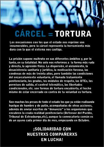 El 1 de Octubre da comienzo de manera coordinada en diferentes cárceles del estado español, la lucha de l@s pres@s contra las torturas y los malos tratos a los que se ven diariamente sometid@s.