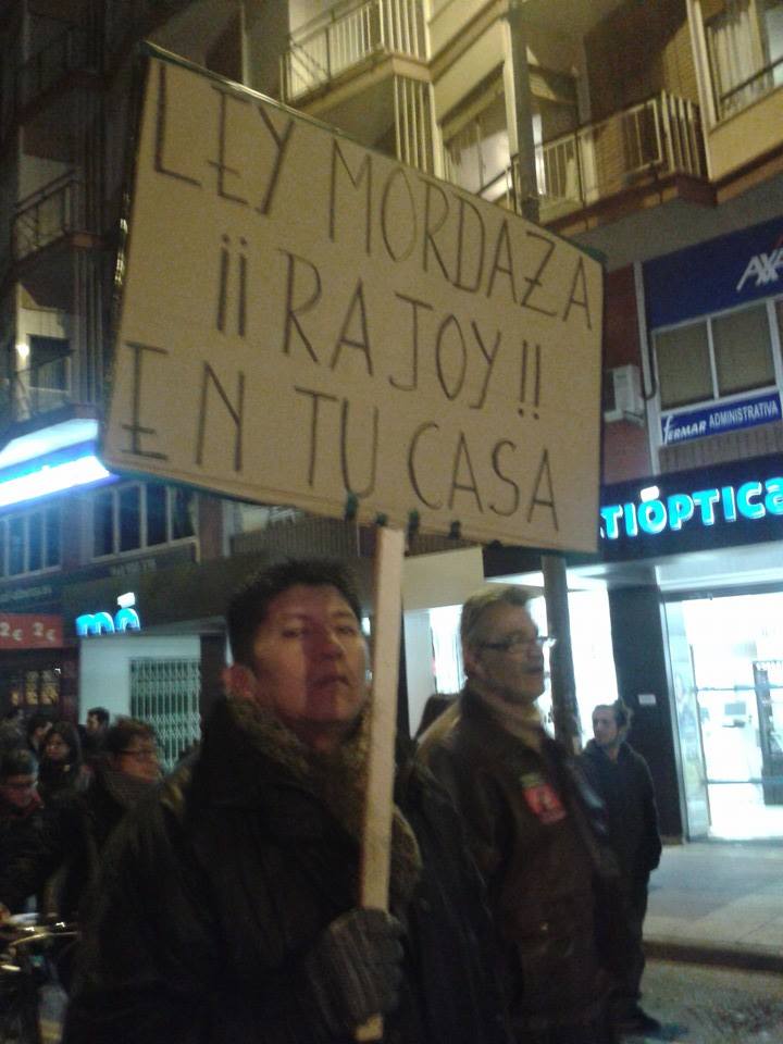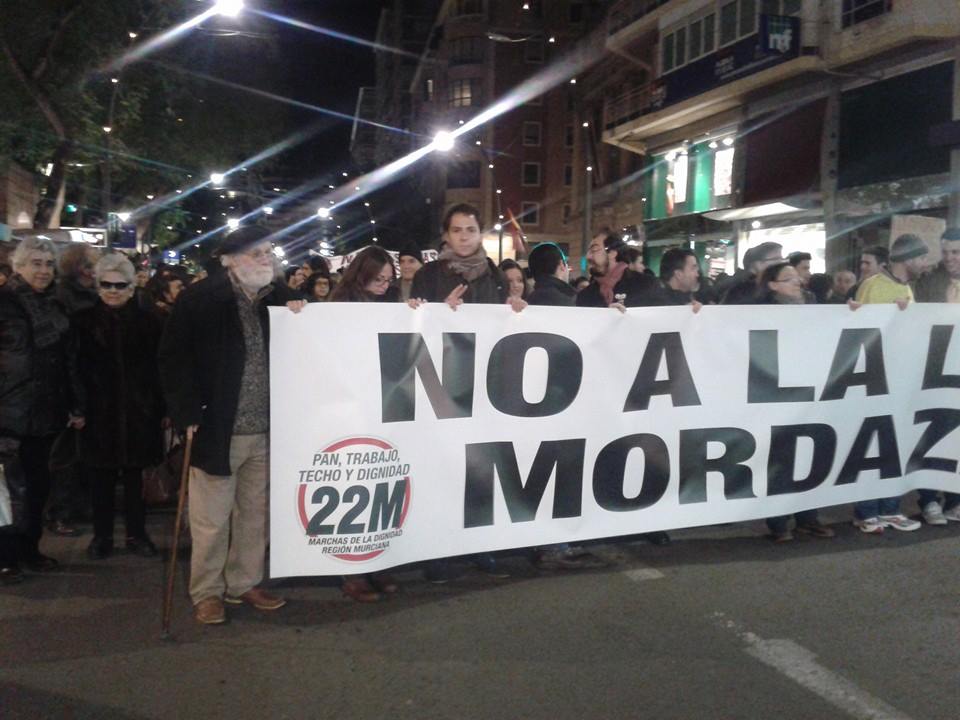 Unas 2.000 personas recorrieron este pasado sábado el centro de Murcia para protestar contra la llamada Ley Mordaza y la Reforma del Código Penal convocadas por las marchas de la dignidad y la plataforma No somos delito . Se pudieron oir gritos como:"No es una ley es una mordaza", "La ley mordaza me la paso por la raja" ," salimos a la calle para que no nos callen" o " lo llaman demoracia y no lo es es una dictadura y lo sabeis".
