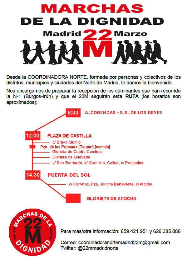 Las marchas están a un día de Madrid, las distintas columnas despiertan simpatía por donde pasan, participan en acciones, asambleas, manifestaciones... Por su parte delegación de gobierno ha movilizado un dispositivo de 1.700 antidisturbios para estos días. Más de 1200 autobuses organizados confirmados para el día 22 llegarán de todas partes del estado.