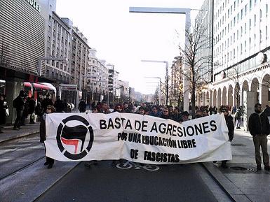 La manifestación ha estado compuesta por cinco bloques -antifascista, laboral, 15M, transfeminista y estudiantil- con pancarta propia, con el objetivo de visibilizar las distintas luchas sociales con sus respectivas protagonistas formando un frente unitario “en lucha por los valores democráticos y de libertad”. Así, en la pancarta de cabecera se leía el lema de convocatoria, detrás colectivos estudiantiles portaban la consigna “la educación es nuestra mejor arma“, a continuación “transfeministas contra el fascismo” reunía a las organizaciones y asambleas feministas, “fuera fascistas de nuestros barrios” con las asambleas del 15M y cerraba el lema del bloque laboral “basta de agresiones, por una educación libre de fascismo“.