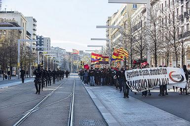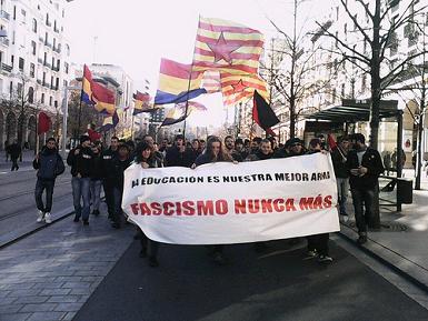 Un año más, Zaragoza ha salido a la calle para mostrar su rechazo unánime al fascismo. Bajo el lema “Aprendiendo del pasado, afrontando el futuro: ¡fascismo nunca más!” cerca de 400 personas han recorrido el centro de la capital aragonesa en una manifestación convocada por Noviembre Antifaixista. La marcha, acompañada por un intenso frio y un desproporcionado despliegue policial, ha transcurrido con total normalidad desde el Paraninfo, atravesando el paseo Independencia, Coso y calle Alfonso, hasta la plaza del Pilar donde miembros de la organización han leído el comunicado.