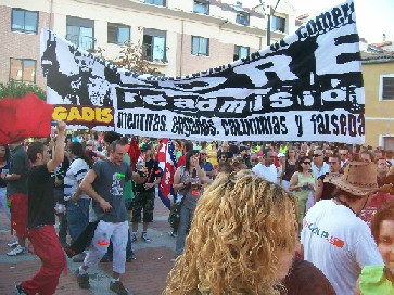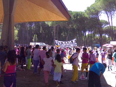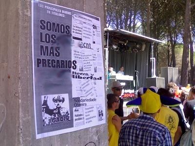 La fiesta multitudinaria tuvo lugar en un merendero a las afueras de Laguna, en un pinar al cual acuden familias enteras a pasar el día y grandes grupos de jóvenes ataviados con los típicos uniformes de las peñas. Al lugar acudieron también varios compañeros de CNT pertrechados con una gran pancarta en la que puede leerse “Basta de explotación en el comercio, Lore readmisión”. Numerosos asistentes se acercaron a interesarse por el conflicto, ya conocido en Laguna, y enseguida se empezó a ver gente que solidariamente portaba una pegatina en la que se lee “Yo no compro en Gadis, Lore readmisión” y carteles en los alrededores denunciando la precariedad en los supermercados Gadis.