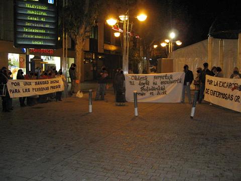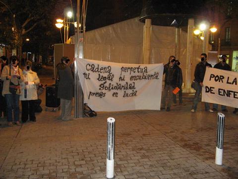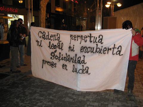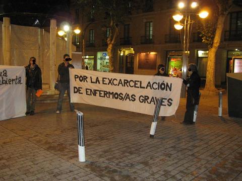 Estaba prevista una mesa informativa pero no acompañaron ni las infraestructuras ni el tiempo, por lo que se decidió suprimirla y dedicar más tiempo a la concentración, donde personas y organizaciones solidarias desplegaron tres pancartas con alusiones a la deficiencia sanitaria dentro de prisión, pidiendo la excarcelación de las personas con enfermedades graves, contra la cadena perpetua legal o encubierta y en solidaridad con las personas presas en lucha.