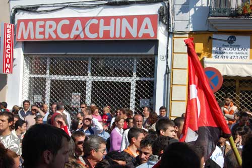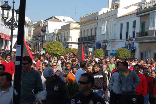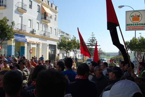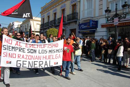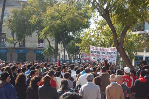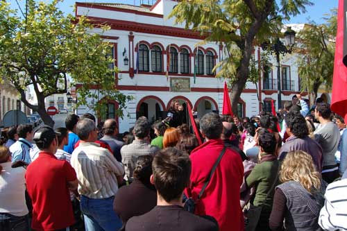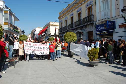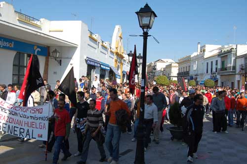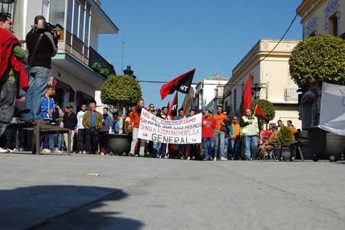 Trabajadores del comercio, de la hosteleria, de la construcción o el metal, los kioskos de prensa o las grandes superficies de la localidad sevillana de Lebrija fueron ayer el escenario de la primera huelga general a consecuencia la crisis que se convoca en el país. Semanas anteriores el sindicato CNT y el Comité de Ciudadan@s impulsaron movilizaciones que reivindicaban el reparto justo del trabajo y el cese del enchufismo municipal. Esto, en un pueblo en el que la tasa de paro llega a casi la mitad de la población.