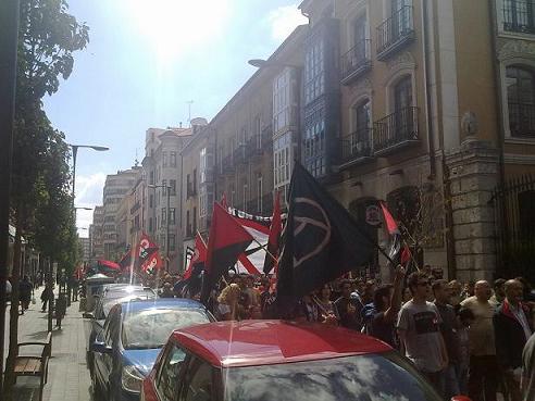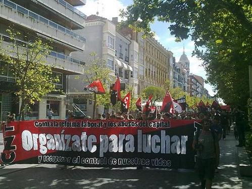 Con un poco de retraso sobre la hora prevista, el medio millar de personas congregadas ayer sábado, partieron de la plaza de Colón encabezada la manifestación con una pancarta en la que se leía "Contra la reforma laboral y los abusos del capital y recuperar el control de nuestras vidas: Organízate para luchar, y recuperar el control de nuestras vidas". La manifestación coincidió en la Acera de Recoletos con un acto por la independencia de los paises sudamericanos, fue en ese momento en el que los manifestantes gritaban "de aquí o de fuera, la misma clase obrera", mientras el alcalde y el consejero de interior de la Junta soltaban sendos mitines.