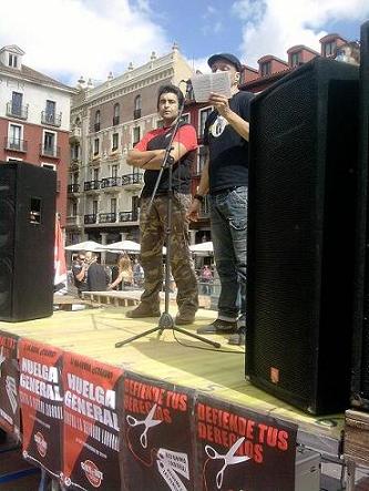 El primero en tomar la palabra fue Mede, un trabajador de la construcción del sindicato de Valladolid, quien agradeció a los presentes la presencia en el acto y tras unas cortas pero intensas palabras en alusión a la huelga, presentó a José Corrales del sindicato madrileño de Villaverde Alto, trabajador de medio ambiente en paro que pasó a enumerar las causas de la crisis, la respuesta que se había dado desde el anarcosindicato y enfatizó en "la necesidad de redoblar esfuerzos en esta huelga, que sin ser convocada por la CNT si que tiene que servir de revulsivo para la auto-organización de los trabajadores". Así mismo se despidió con el punto de mira puesto en la jornada del 29 de Septiembre con un "nos vemos en la cola del INEM, nos vemos en los parques, en los tajos, nos vemos en los piquetes, nos vemos en la huelga general".