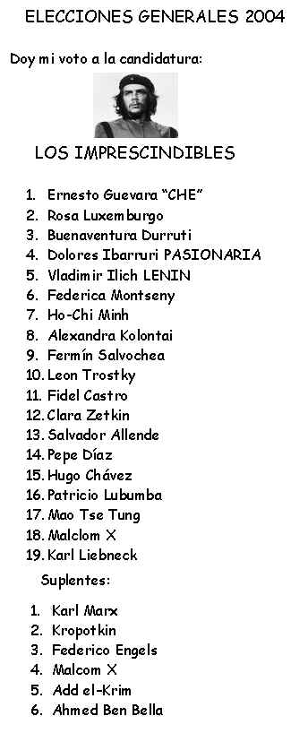 Sin embargo, en el último instante, y cuando ya estaba casi todo perdido, hemos comprobado que hay una candidatura que sí resume al tipo de personas que nos gustaría ver en una Institución. Son unos candidatos revolucionarios, sin matices, que no van a pactar más que con el respeto a los débiles. Son íntegros y lo demostraron. Son miembros de una candidatura que dirían NO a la Europa del capital, SI a la República, No a la monarquía borbónica, SI a la resistencia activa contra el imperialismo en cualquiera de sus manifestaciones. En fin, ustedes los conocen a todos, quizá no ocurra lo mismo con otras candidaturas, y seguro que acaban, como nosotros, votándolos. Porque no es un ejercicio de nostalgia, sino un acto de rebeldía.