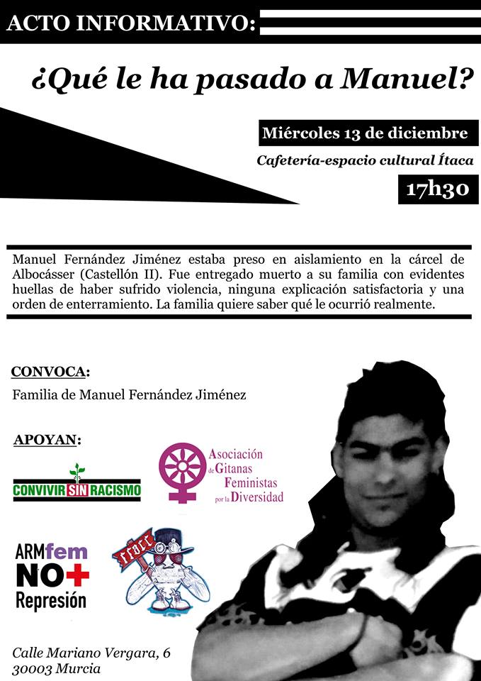 La Opinión: Investigan la muerte de un recluso murciano en la cárcel de Castellónkaosenlared: Denuncian la situación de un preso muerto en la cárcel de Albocàsser (Castellón II)PRES.O.S. Preso muerto con signos de torturas en todo el cuerpoLa Crónica del Pajarito: Investigan la extraña muerte de un joven de 28 años con signos de violencia en la cárcel de CastellónEl Correo: ¿Qué le pasó a Manuel?La Verdad: ¿Qué le pasó a Manuel?
