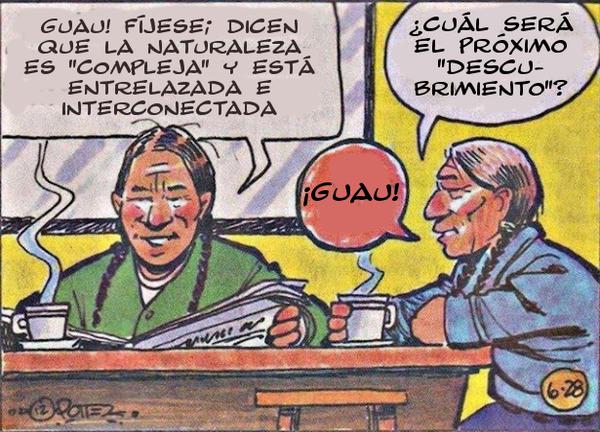 La Alianza Pachamama, organización establecida en Estados Unidos que colabora con los pueblos indígenas Achuar de Ecuador, publicó un meme en el año 2012 que mostraba a dos indígenas debatiendo sobre un “descubrimiento científico” reciente: nuestro mundo se encuentra estrechamente interconectado. Evidentemente, el chiste se basa en que unos científicos puedan “descubrir” un concepto que forma parte de la sabiduría milenaria de los pueblos indígenas de todo el mundo. Me entusiasmó la doble genialidad de la caricatura, la manera en la que resaltaba la importancia de comprender el mundo en el que vivimos a la vez que planteaba explícitamente los peligros de la apropiación cultural e intelectual.