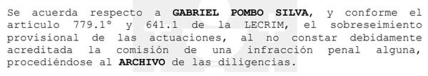 Extracto de la parte dispositiva del auto por el que el Juzgado de Instrucción número 4 de Vigo sobresee la investigación sobre Gabriel Pombo da Silva.