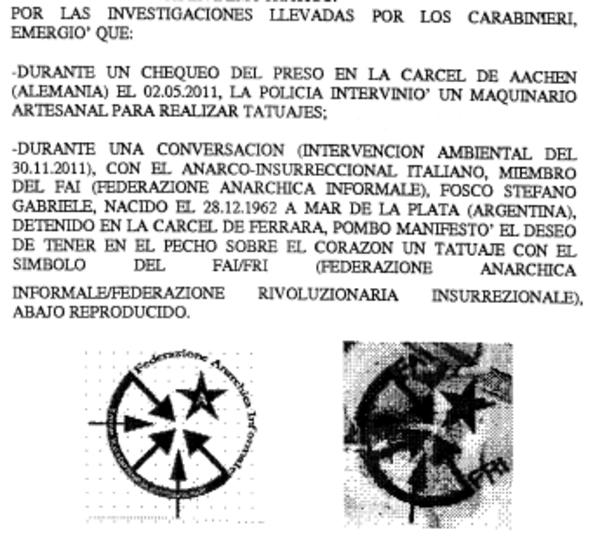 Elisa se refiere a la operación Ardire (osadía en español), llevada a cabo en junio de 2012 contra el movimiento anarquista en Italia —al estilo de las operaciones españolas Pandora, Piñata e ICE—, y que acabó con la detención de ocho personas, entre las que se encontraba ella misma, la orden de medidas cautelares para dos presos en cárceles de Alemania y Suiza, uno de ellos Gabriel Pombo, y el interrogatorio de otras 24 personas. En junio de 2012, Italia emitió una orden europea de detención contra Gabriel en la que señalaba que estaba acusado de ser miembro de una organización terrorista que actuaba en Alemania, Italia y Suiza, mientras estaba en la prisión de Aachen. Entre las pruebas que citaba de su posible implicación, la intervención de un “maquinario artesanal para realizar tatuajes” y una conversación que tuvo con un anarquista italiano en la que decía que se quería tatuar en el pecho el símbolo de la Federazione Anarchica Informale / Federazione Rivoluzionaria Insurrezionale (FAI/FRI). Y ya. La orden de detención italiana fue retirada dos años después.