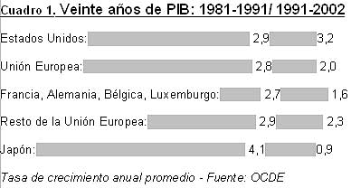 Se observa así, a todo lo largo de los años noventa, la profundización de una doble divergencia. Por una parte, el crecimiento en Estados Unidos se vuelve netamente superior (en más de un punto porcentual) al de Europa, mientras que la tasa de crecimiento era similar en la década de los ochenta (cuadro 1). Por otra parte, se opera una segunda diferenciación dentro de Europa. En la última década, el crecimiento promedio ha sido de 2% para el conjunto de los países europeos. Pero fue claramente menor (1,6%) para la "zona franco-marco" (Francia, Alemania, Bélgica, Luxemburgo) que para el resto de la Unión Europea (2,3%) y, en especial, para un grupo de países (España, Gran Bretaña, Irlanda y Finlandia) que ha tenido un crecimiento medio de 2,8%, cercano al de Estados Unidos. Es, por lo tanto, como si la divergencia Estados Unidos/Europa funcionara como una palanca que viene a polarizar un crecimiento europeo que, hasta entonces, era relativamente homogéneo.