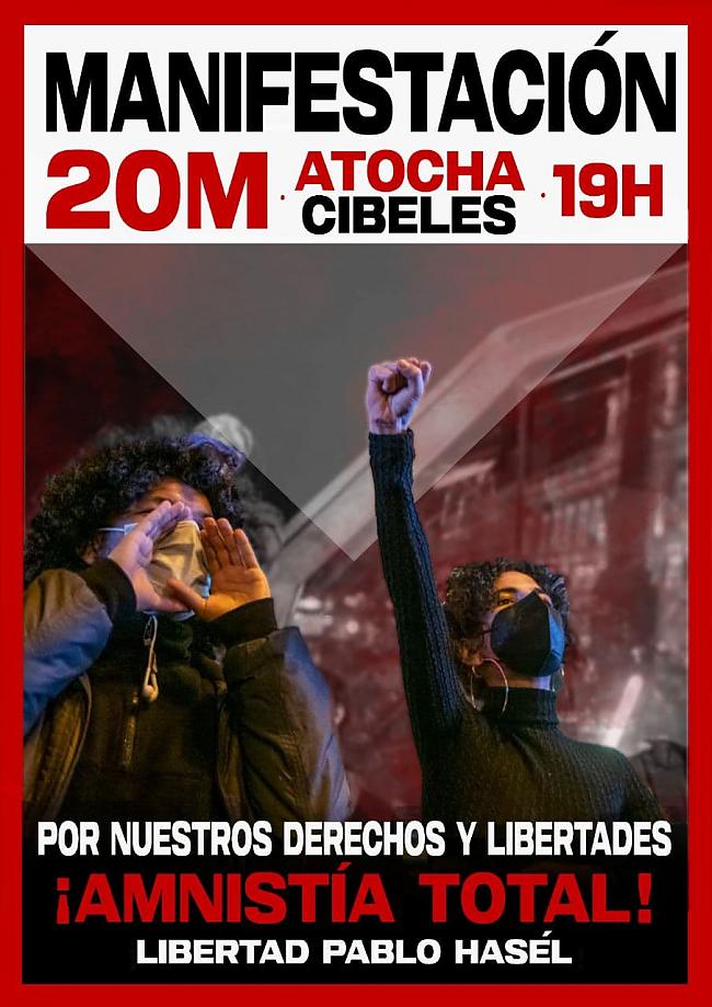 El próximo 20 de marzo vamos a salir a las calles para reivindicar todos y cada uno de nuestros derechos y libertades que, día a día, se ven amenazados y reprimidos. También, a más de un mes de su encarcelamiento, pedimos la libertad de Pablo Hasel y de todos los presos políticos de nuestro país, ¡amnistía total!