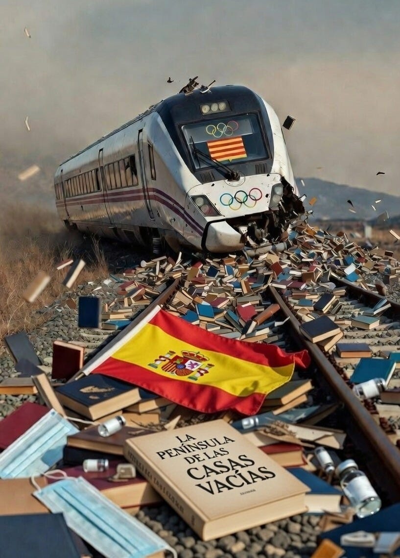 Sin embargo, esa democracia que, según nos repiten, todos los españoles nos dimos en 1978, marcando un descacharrante antes y después con el régimen franquista, ha descarrilado de manera tan funesta como simbólica en uno de los tramos del trayecto de alta velocidad Madrid-Sevilla, inaugurado precisamente en 1992 para proyectarnos al exterior como potencia moderna. Esta tragedia no solo estaba ya anunciada, sino que se mostraba como inevitable e incluso inminente desde el mismo momento en que la estación de la que salió el tren (la más importante de España) pasó de denominarse Puerta de Atocha a ser rebautizada por despótico designio político como Almudena Grandes. Para cualquiera que sepa que la realidad no se puede moldear a antojo, debiera quedar claro que de una estación llamada Almudena Grandes solo pueden salir potenciales trenes de la muerte que acabarán asesinando a ciudadanos: no porque esta escritora-ideóloga de quinta fila, sintaxis vintage y tramas ultraprocesadas tenga ningún influjo maléfico, sino porque el hecho de que en la España (o, si ustedes quieren, en el Madrid) de Cervantes, Quevedo, Góngora, Valle-Inclán o Delibes una estación lleve su partidista nombre muestra que la corrupción ha alcanzado ya su máximo nivel.