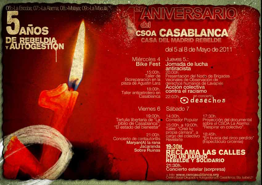 Del 4 al 8 de Mayo, Casablanca nos invita a celebrar su primer aniversario, a la vez que el 5º aniversario del comienzo del proyecto de okupación en Lavapiés, con el CSOA La Escoba, en Mesón de paredes.