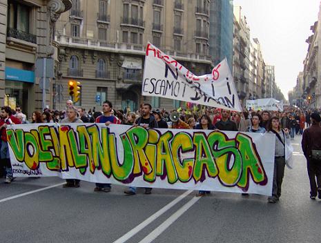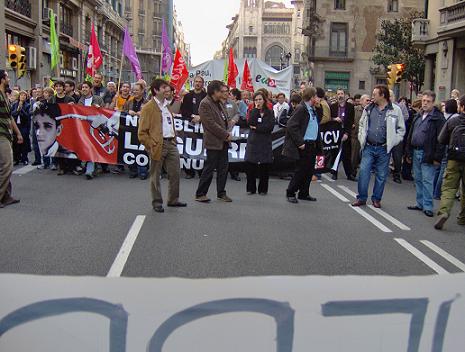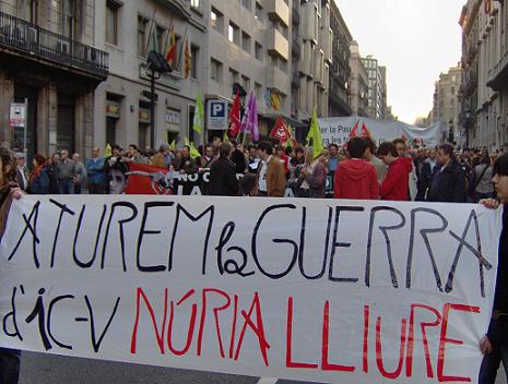 Unos minutos después de empezar la marcha, este grupo desplegó dos pancartas justo delante de la Iniciativa en las que ponía "Volem la Nuria a casa" y "Aturem la guerra de ICV. LLibertad Nuria!" Asimismo se cantaron consignas contra la comitiva de Iniciativa, en la cual se encontraban importantes cargos de Iniciativa como el diputado Joan Herrera, entre las que cabe destacar " Nuria al carrer, Saura a la presó"; y "Nuria llibertat". Estos gritos lograron poner en evidencia al conjunto de militantes de Iniciativa, que se encontraban allí dando un paseo hipócrita por la paz para hacerse una foto y lograr arrancar unos votos de cara a las próximas elecciones municipales. Ante los gritos que se proclamaron contra ellos, respondieron de una manera triste y ridícula con consignas como " No a la guerra. Aznar a la presó".