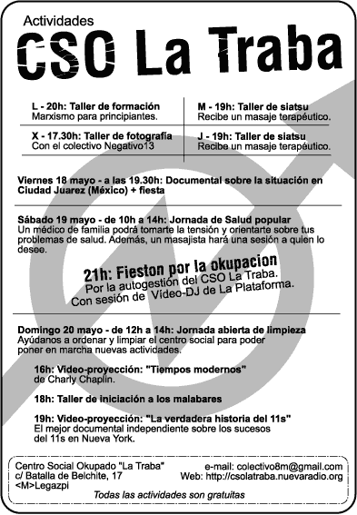 Actividades 14-20 mayo en CSO La Traba: Talleres, proyecciones, fiesta con Video-DJ...