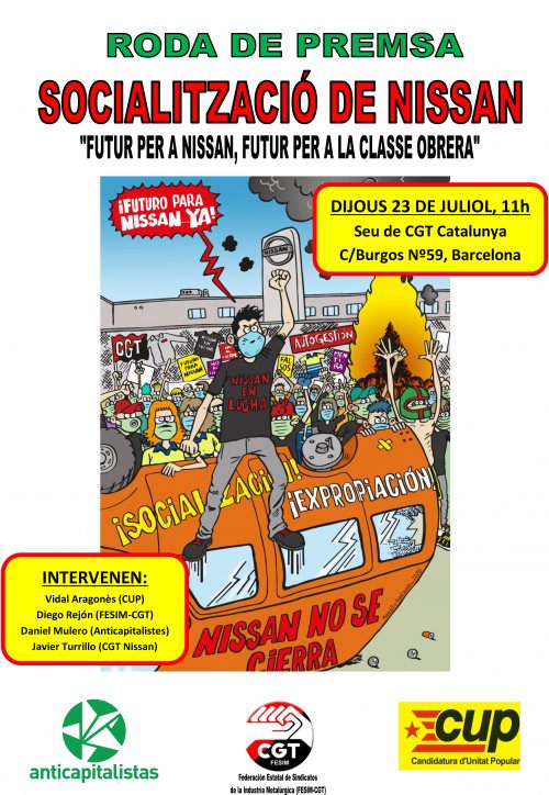 Davant l’immobilisme de les institucions per donar una solució a les milers d'afectades i afectats per l'anunci de tancament de Nissan; Anticapitalistes, CGT i CUP, convoquen als mitjans i periodistes per presentar i informar sobre el projecte de socialització i transformació de les plantes de la multinacional japonesa a Catalunya. Amb propostes per mantenir l'ocupació, la sobirania industrial i sota criteris de transició ecològica, que aquestes organitzacions han elaborat en les darreres setmanes.