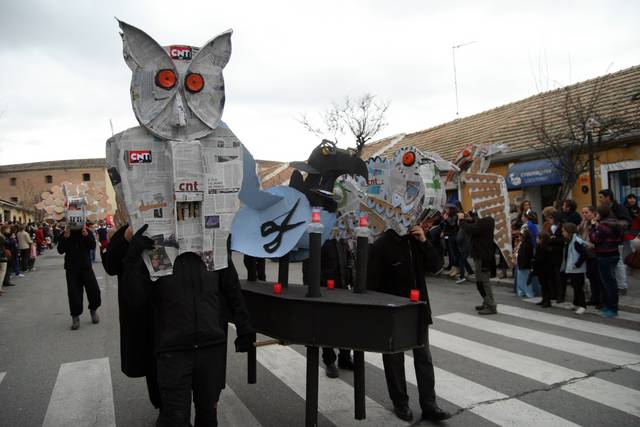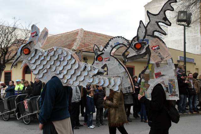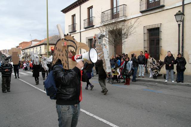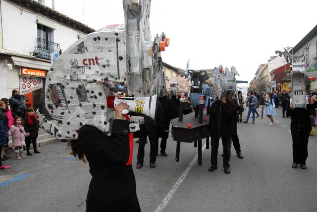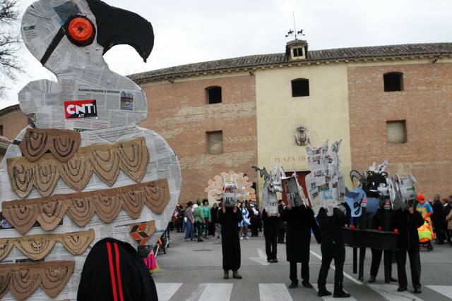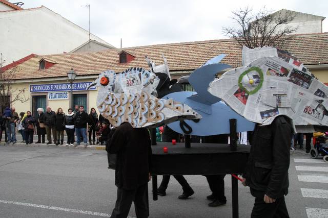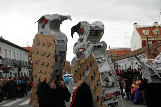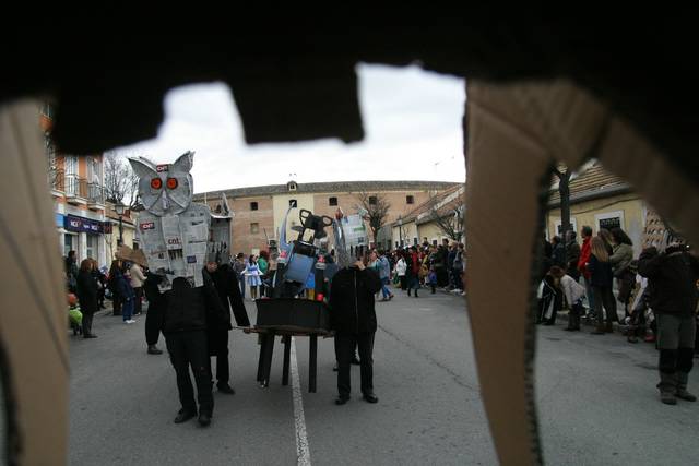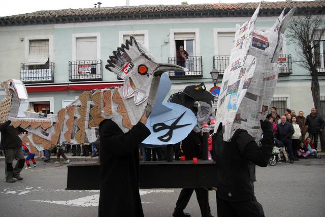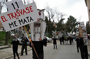 Esta vez ha salido en comparsa aprovechando la festividad del carnaval, para escenificar el entierro del entorno natural y del Tajo. Con admirables y laboriosos cabezudos que representaban los animalillos de la vega, un ataúd portador del fallecido río y el pesado buitre de los recortes encima, que bien parecía a Montoro, marchamos juntos con júbilo por las céntricas calles del pueblo, animando a la gente a tomar conciencia a nuestro paso. El objetivo era visibilizar la problemática que supone la sangría de nuestro río y mantener latente la repulsa social que ponga frenos a la amenaza que supone el llamado memorandum del trasvase Tajo-Segura aprobado definitivamente con rango de ley el pasado noviembre.
