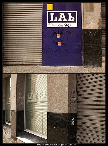 La sede de LAB en Bilbo ha sido lugar para que Falange Española esparza su basura fascista. Han pasado unos pocos meses desde que Falange Española criticase los métodos de Falange y Tradición que eran los mismos con la diferencia que Falange y Tradición llegó a realizar amenazas de muerte directas como en el caso de la Txupinera.