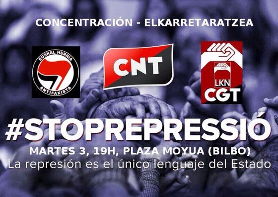 CGT, CNT y el colectivo Sare Antifaxista, hacen un llamamiento a todas las organizaciones sindicales y sociales a acudir a esta concentración en solidaridad con el pueblo trabajador de Catalunya.