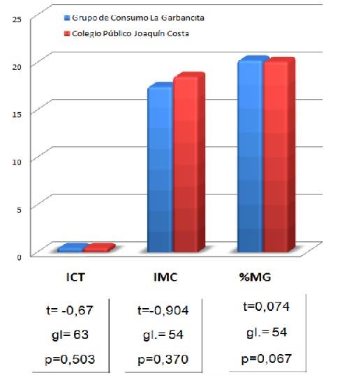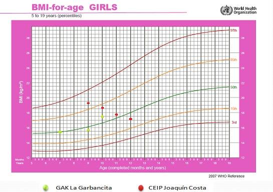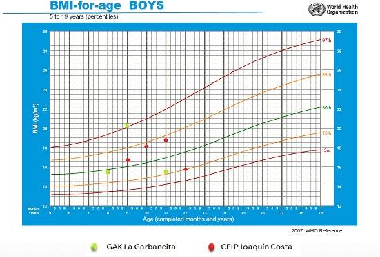No se observan diferencias estadísticamente significativas en cuanto a los indicadores de obesidad entre ambos grupos. Con objeto de conocer el estado nutricional de los niños y niñas con respecto a los valores recomendados, se calcularon los valores de la mediana de IMC por edad y sexo y se representaron sobre las curvas estándar para el IMC publicadas por la OMS en 2007.