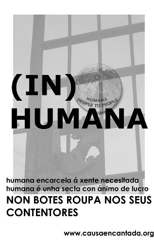 Todo comecou quando soubemos que Humana apresentara uma denúncia contra uma mulher de 60 anos e contra o seu filho por colher roupa dum contentor por pura necesidade lá por novembro de 2004. Depois de investigar pola rede, vimos que a tal suposta ONG é uma pantalha económica da seita Tvind cuio líder está a ser julgado por fraude, evasom de impostos, abuso de confianca e enriquecemento (com o dinheiro das actividades "humanitárias").