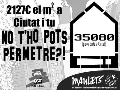A la nostra ciutat hi existeixen, segons xifres de l’any 2001, uns 35080 habitatges buits. Mentre aquest pisos continuen buits, el preu de l’habitatge a Palma es segueix incrementant. D’aquesta manera, a hores d’ara, el metre quadrat mitjà es situa en l’escandalosa xifra de 2127 euros.
