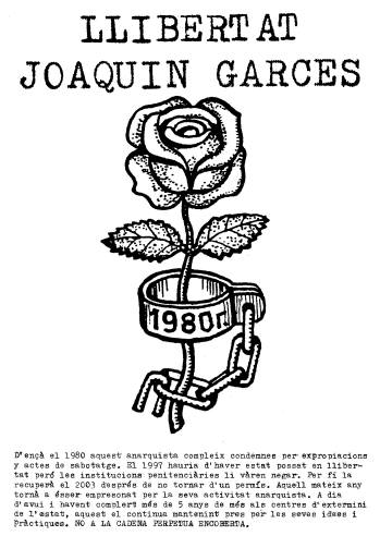 Joaquín Garcés Villacampa, es un compañero anarquista que actualmente se encuentra preso en el centro penitenciario de Castellón. Entró en prisión, a raíz de su detención por varias acciones de expropiación para apoyar las luchas y organizaciones revolucionarias de finales de los años 70 y fue condenado a 35 años y seis meses de prisión, pena que comenzó a extinguir a mediados de 1980. En 1999, a raíz de la lucha colectiva contra el FIES, Joaquín participó activamente y llevó a cabo diferentes ayunos y huelgas de hambre por los cuatro puntos de reivindicación colectiva, conforme a lo que estipulaba la ley: - El fin de las torturas, el cierre de los departamentos FIES. - El cese de la dispersión. - La libertad para las personas con enfermedades incurables y terminales. - La libertad para las personas que hayan cumplido más de 20 años de condena.