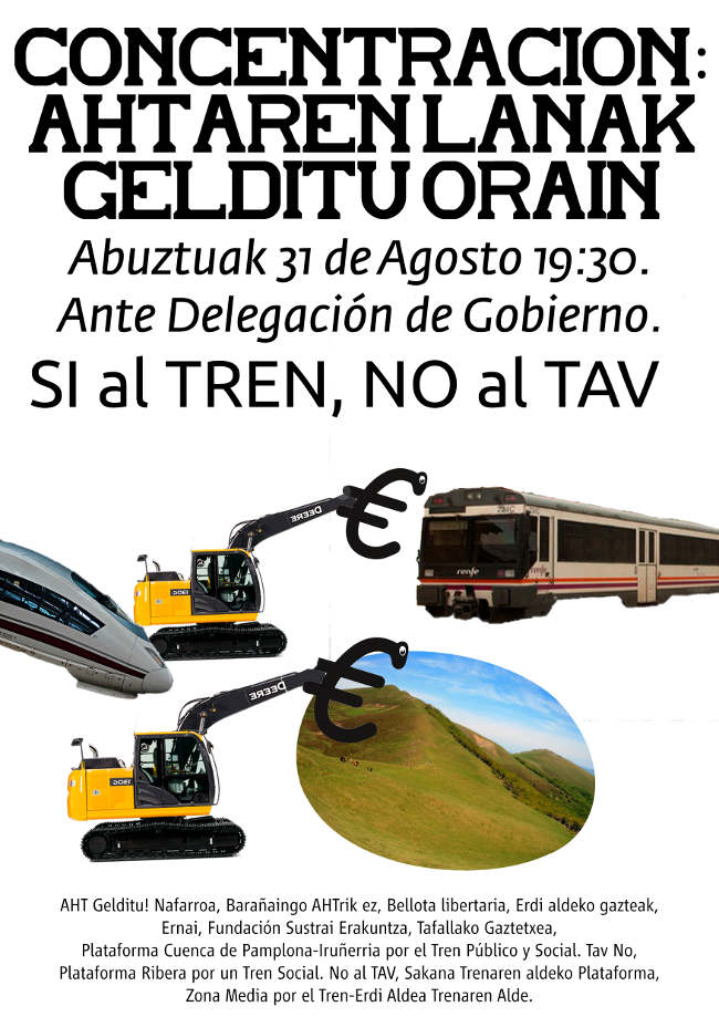 Las organizaciones y los colectivos abajo firmantes hacemos pública nuestra denuncia por la continuación de las obras del llamado Corredor Navarro del Tren de Alta Velocidad (TAV) y hacemos un llamamiento a participar en la concentración que se celebrará el viernes 31 a las 19:30 ante la Delegación del Gobierno bajo el lema de ¡¡ PARALIZACIÓN DE LAS OBRAS DEL TAV YA !! Exigimos la paralización inmediata de las obras recién comenzadas entre Peralta y Olite y la anulación de las adjudicaciones de obras ya realizadas o en fase de tramitación.