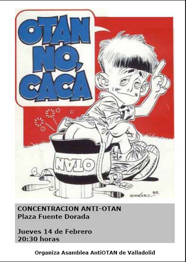 La Asamblea antiOTAN de Valladolid, constituida hace un año para luchar contra la OTAN, las bases y las industrias militares, ha convocado a los ciudadanos y ciudadanas de Valladolid a movilizarse contra la decisión de instalar una nueva base militar de la OTAN, sea cual sea su ubicación. JUEVES DÍA 14 DE FEBRERO, A LAS 20:30 HORAS, TODOS/AS A LA CONCENTRACIÓN ANTI-OTAN EN LA PLAZA FUENTE DORADA.