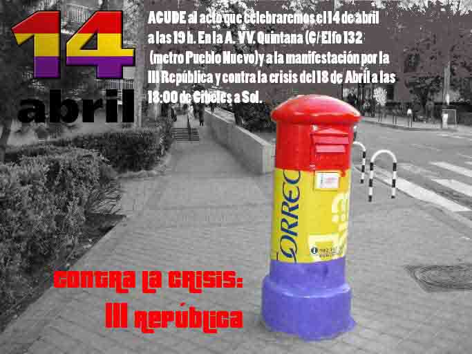 ACUDE al acto que celebraremos el 14 de abril a las 19 hs. En la A. VV. Quintana (C/ Elfo 132 metro Pueblo Nuevo) y a la manifestación por la III República y contra la crisis del 18 de Abril a las 18h de Cibeles a Sol.