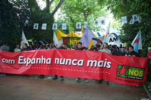 Pouco antes das doze da manhá partia da Alameda de Compostela, entre gritos de "Independencia" e "Antom, Estrela liberdade", a mobilizacom nacional convocada por NóS-UP. Perto de 450 pessoas secundárom a manifestacom que sob a legenda "Com Espanha Nunca Mais" ia encabecada por membros da Direccom Nacional da organizacom política unitária da esquerda independentista.