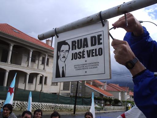 Os actos iniciavam-se com a colocacom simbólica de umha placa na rua que leva o seu nome e que fora retirada sem sabermos o motivo. É de destacar a importante presenca de familiares e amig@s do José Velo, desejos@s de lhe render a homenagem que umha pessoa como ele merescia e que noutras ocasioes as longas maos da direita local tinham impedido sob acusacoes de terrorismos e outras úteis para o afogamento da memória histórica.