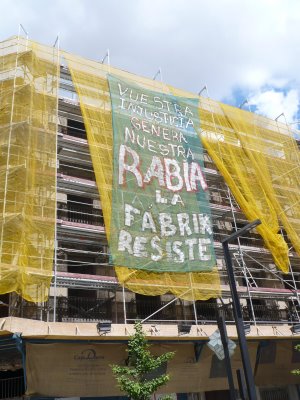 Entre carteles, elegantes plantillas e instrumentos improvisados el mar de navegantes avanzó por calle Elvira, paró en la plaza del Arco Elvira y en el mercado de San Agustín. Tras éste, la nueva dirección fue Gran Vía. Allí se cortó la calle de manera espontánea y ruidosa y se desplegó una pancarta enorme que decía: vuestra injusticia genera nuestra rabia, ¡la Fábrica resiste!