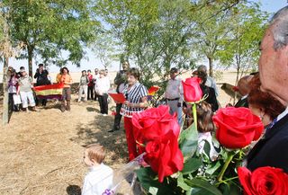 Vamos en una pequeña comitiva encabezada por la bandera republicana y por varios familiares con ramos de flores. Calles vacias que reflejan precisamente eso, el vacio hacia los que pasamos. Nadie sale a mirar, nadie en las puertas, nadie en las ventanas, uno que pasa y ni mira ni saluda… “Seguramente como el dia que trajeron a los de la fosa”, comenta alguien.